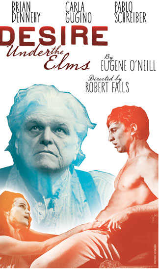 The Goodman Theatre’s Desire Under the Elms has come to the St. James Theatre.  Last night was the first night of previews in this limited NYC production.  Starring Brian Dennehy, Carla Gugino (Suddenly Last Summer) and Pablo Schreiber (Awake and Sing) and directed by Robert Falls (Death of a Salesman, Long Days Journey into Night) this remarkable production is going to create a stir.  The play itself (Eugene O’Neill) holds few surprises but packs an emotional wallop nonetheless.  It has good structure and as bizarre as this sounds, is the perfect starting point for this production. What is really going on, on the very large stage, is cinematic in scope.  This production is HUGE.  There are hydraulics, gargantuan set pieces, farm animals and lots of smashing and hurling.  It is a credit to the cast that they were never overpowered by the set and design.  There is an actual house that is raised and lowered throughout the production, which often hangs over the family.  Metaphor aside, I was terrified.  Call me a worry wart, but I did not entirely trust the cables.  This being the first night, the hydraulics were often a bit slow on the uptake, leaving yawning holes in the stage for minutes.  I was concerned for the actors’ safety.  All of this motion is not actually distracting; in fact it takes a relatively sedate play and brings it into the 21st century attention span demands. Music is used as a powerful device in this production.  There is one scene that has no dialogue, just a riveting musical accompaniment, lending a modern cinematic touch.  At one point a “violinist” comes on upstage.  He is obviously “bow synching” his playing (I’m not sure why) and lends an edgy touch.  The opening and closing music that accompanies father and sons as they tow rocks is pitch perfect in tone and emotion. The set is very dark, and the music works to give it a more colorful dimension.  The set and costuming echoes the bleakness of the storyline, and in such a large space does not feel overly oppressive.
